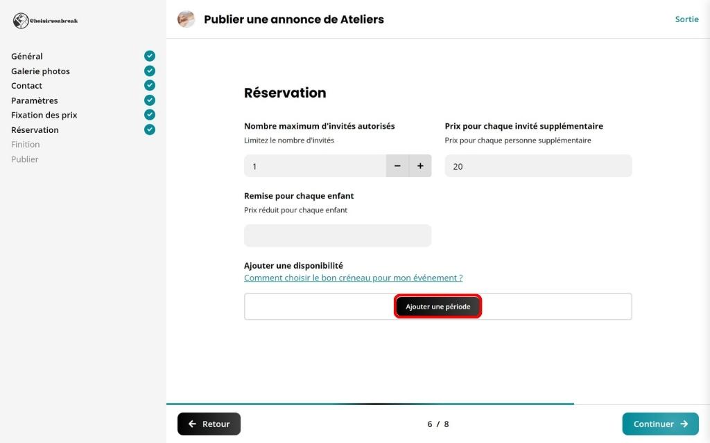 7 – Remplissez le champ Nombres maximum d’invités autorisés (correspond au nombre maximum de personne en même temps lors de la prestation), Prix pour chaque invités supplémentaire (correspond au tarif appliqué pour chaque personne ajouté à la même prestations, exemple: un massage pour deux). Ajoutez vos disponibilités dans l’onglet Ajouter une disponibilité. Un tutoriel est mis à votre disposition pour vous accompagner dans la mise en place de vos créneaux, consulter le tutoriel.
